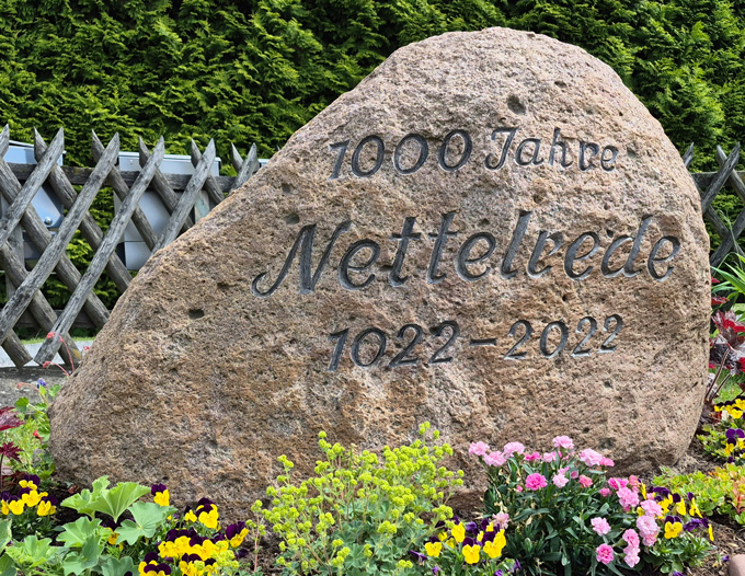 Der Stein wurde am 01. Mai 2025 eingeweiht. Er erinnert nicht nur an die 1000jährige Geschichte sondern soll auch als Symbol für die Dorfgemeinschaft stehen. Der eiszeitliche Findling aus Skandinavien wiegt mehr als eine Tonne und lag viele Jahre im Garten von Willi Lohmann. Wilhelm Wehrhahn hat den Stein mit schwerem Gerät von Harenberg nach Nettelrede gebracht und Steinmetz Stephan Graf brachte die Inschrift an.