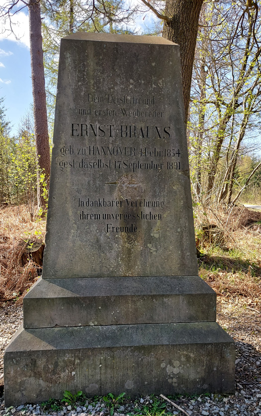 Oberhalb der Deister-Freilichtbühne am Rodelbahnweg steht unübersehbar der Gedenkstein für "Deistervater" Ernst Brauns. Es gibt eine kleine Grünfläche mit Bänken.