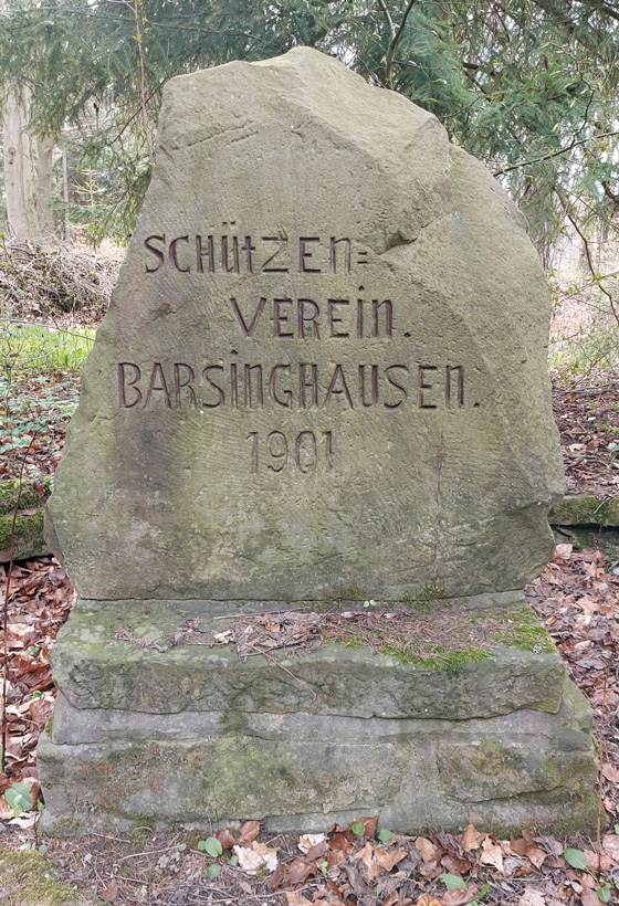 Auf dem Gelände des Schützenvereins gibt es gleich zwei Gedenksteine. Vom Parkplatz kommend steht dieser Stein hier hinter dem Gebäude auf der rechten Seite. Er wurde bei der Gründung des Schützenvereins im Jahr 1901 aufgestellt. Vorsitzender war Carl Pförtner und es gab einen Schießstand im Wittkopp'schen Steinbruch. Bis 1915 wurden hier wochentags Steine gebrochen und sonntags trafen sich die Schützen zum Schießen.