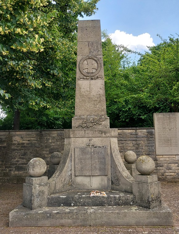 In Brullsen sind gleich drei Denkmäler zusammen auf einem Platz. Eine Säule zur Erinnerung an die Opfer des 1. Weltkriegs, Tafeln an der Mauer zum Gedenken an die Gefallenen des 2. Weltkriegs und eine weitereSäule zu Ehren Martin Luthers.
