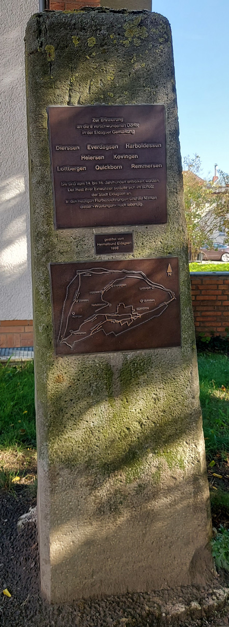 Gesponsert von Volksbank und Kreissparkasse und erstellt von Steinmetzmeister Dziubek soll der Stein an die acht Dörfer erinnern, die einst in der Eldagsener Flur angesiedelt waren. Der Wissenschaftler Dr. Hans-Heinrich Seedorf und der Heimatforscher Hans Dobbertin hatten die verschwundenen Dörfer ausfindig gemacht.