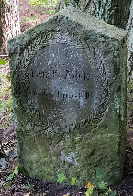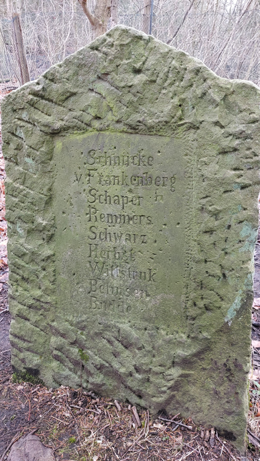 Zur Goldenen Hochzeit von Ernst Freiherr Knigge und seiner Frau Adele schenkten ihnen die auf der Rückseite des Steins genannnten Angestellten diesen Stein und pflanzten direkt dahinter eine Roteiche.